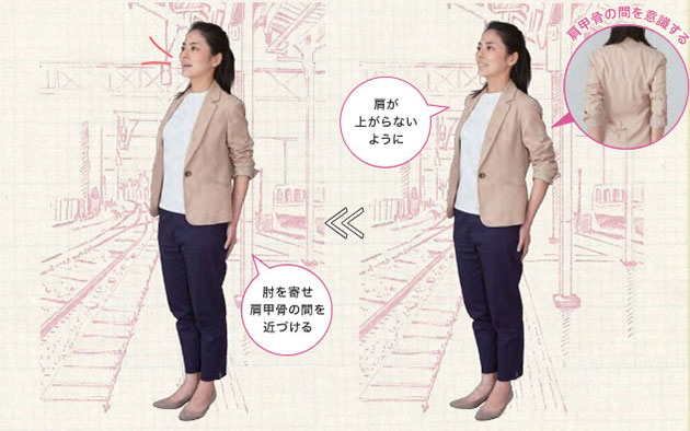 肩甲骨の間をしっかり寄せる動作で、こりを根本から改善します。